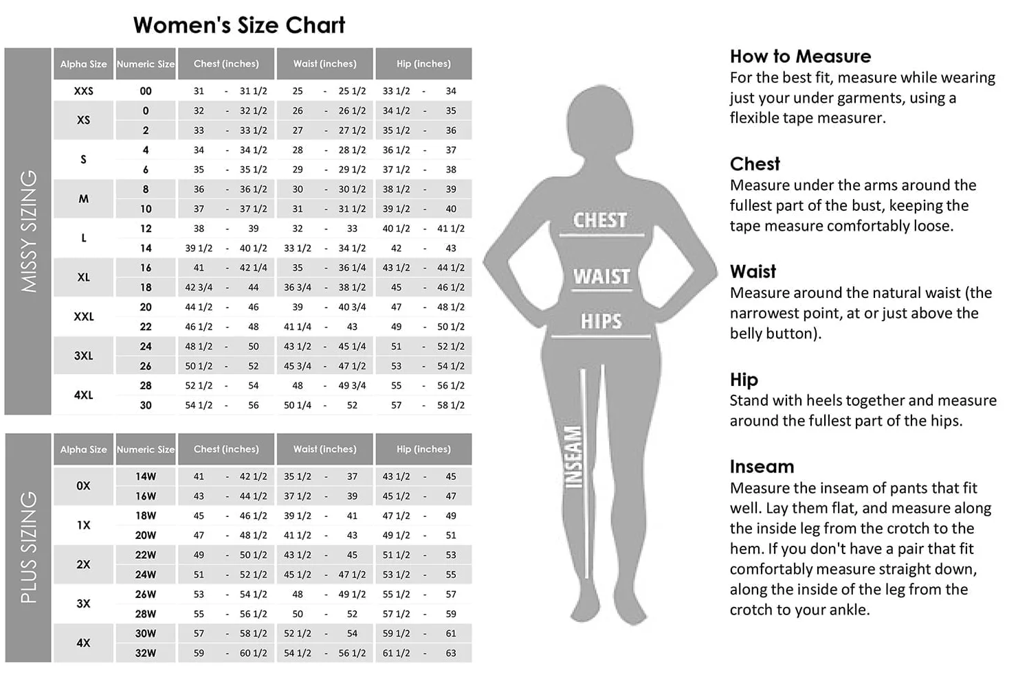Հասանելի չափսեր. Հասանելի է կանացի 2-22 չափսերով՝ 28, 30 և 32 դյույմ ներքին կարերի երկարությամբ։