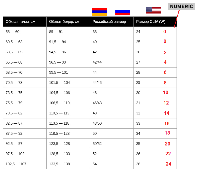 Չափսերը (NUMERIC) 2-ից 28 (ամերիկյան չափեր)